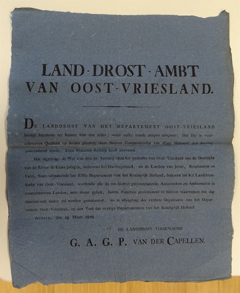 Geplaatst op: 30 maart 2017 Hoort bij: autobio, Geschiedenis 6 reactiesGisterochtend in alle vroegte naar het Nationaal Archief in Den Haag om in het archief van het Ministerie van Binnenlandsche Zaken van de Franse Tijd te kijken of dat een bepaalde bron bevatte. Dat bleek niet het geval. Kwam, zoals gewoonlijk, onderweg wel andere fraaiigheden tegen. Zoals de proclamatie uit maart 1808 waarbij de nieuwe Landdrost van het pas geannexeerde Oost-Friesland zich kenbaar maakte: