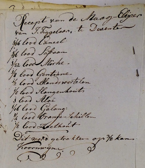 Een recept voor het maagelixer van J. Tiggelaar te Deventer: