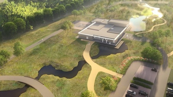 Alle voorzieningen, zoals parkeerterrein, zijn dat ook. O ja, er komt een strooiveld naast. Of dat ook vanzelf spreekt, zou ik niet weten. Van bovenaf komt het een en ander er zo uit te zien, daar naast de Bruilweering. Een meanderend beekje loopt onder het complex door: