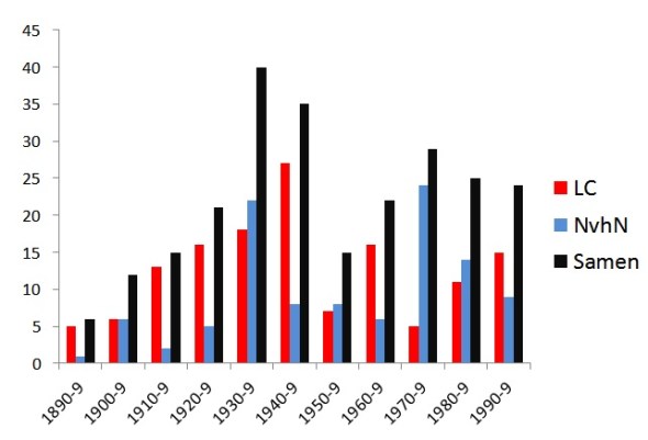 Frequentie van de term ‘mispunt’ in de Leeuwarder Courant, het Nieuwsblad van het Noorden en beide kranten samen, per tien jaar.