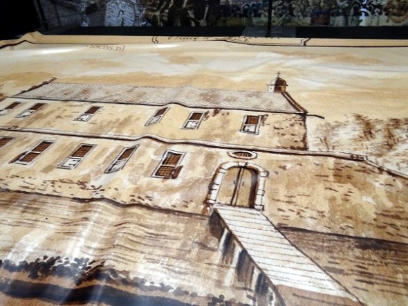 Voor het opknappen van het interieur kwam onlangs Europees geld los. Helaas is er in de loop der tijden nogal wat verbouwd in het pand, en houdt het aantal ondubbelzinnige sporen van de oorspronkelijke inrichting niet over. Maar deze vaas lijkt me empire en de schildering zal dan uit de eerste decennia van de negentiende eeuw stammen.