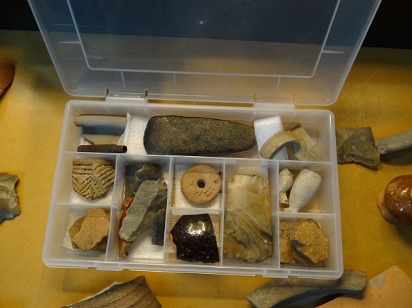 Doos met kleine archeologische schatten (vuistbijl, trechterbekerscherf, gouds pijpekopje, spinklosje, schrabber etc.):