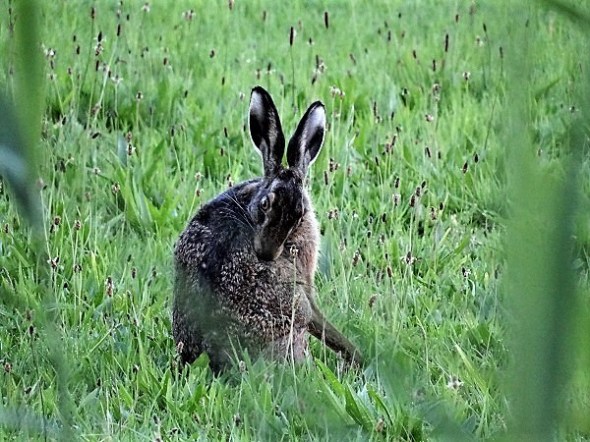 Ik fietste eerst een eind verder en keerde toen terug. De haas zat opnieuw vlakbij de weg, waande zich veilig achter een gordijn van riet en was zich aan het poetsen, misschien had hij last van ongedierte: