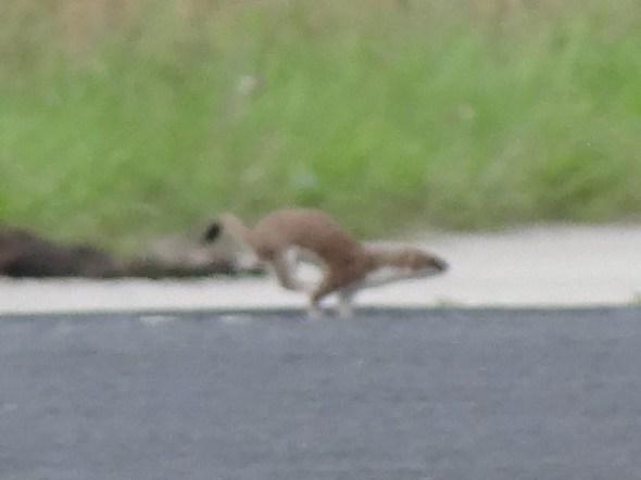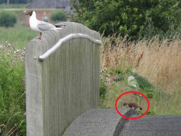 Zag ik opeens iets bruin-wits met een zwarte staartpunt heen en weer flitsen en buitelen over de volle breedte van de brug – de beroemde Onlander hermelijn!: