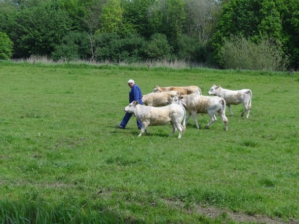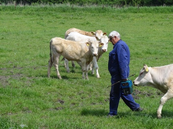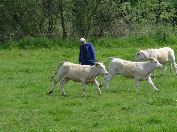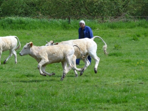 Geplaatst op: 13 mei 2018 Hoort bij: Dieren, Hoogkerk 2 reactiesIn het Viooltjesland aan de Roderwolderdijk, tussen de boerderij van Landschapsbeheer en Vierverlaten, grazen de laatste jaren vaak vijf of zes jonge Blondes d’Aquitaine . Gistermiddag fietste ik richting Vierverlaten, toen de kleine kudde het op haar heupen kreeg en in een steeds snellere draf naar een achter mijn rug liggende hoek van het weiland holde. Daar kwam hun baas tevoorschijn met een schrikdraadapparaat. Ze dansten om hem heen alsof ze voor het eerst van hun leven in een weiland kwamen en begeleidden hem helemaal naar het hek aan de andere kant van het perceel:
