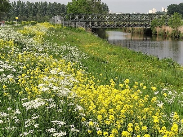 Fluitekruid, raapzaad en boterbloemen op de oever van het Peizerdiep bij de Baileybrug: