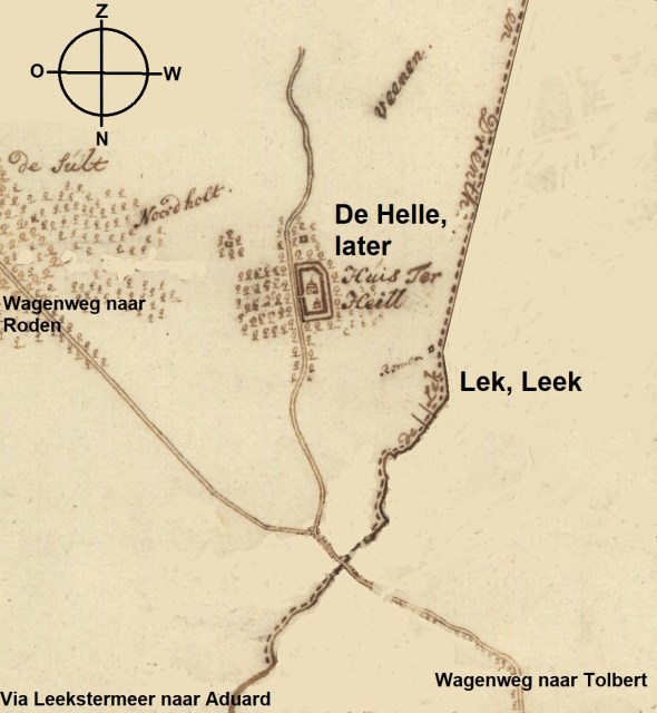 De onderstreepte namen, komen ook voor op de veldnamenkaart van Wieringa, ca. 1970 (zie HisGis). Opvallend zijn het Vagevuur (dat als het ware reageert op De Helle, ooit een schansje) en de Tichelkamp, een plek waar potklei zal zijn gewonnen. Het Leeksterveld, het Zuiderveld, het Baggelveld en de naamloos gescheiden venen hebben te maken met de winning van turf. Toch zullen deze venen niet allemaal al in de Middeleeuwen in exploitatie zijn genomen. Het Zuiderveld ten zuidwesten van De Helle, en het |Leeksterveld even over de provinciegrens kwamen pas veel later aan snee. Het Baggelveld, dichter bij de uithof, heeft dan wat betere papieren, ook omdat baggelen duidt op laagveenderij (vanonder de grondwaterspiegel vandaan), die een turf met een hogere calorische waarde voor de steenbakkerij opleverde. Verder lijken ook de Santeekampen – overgenomen van of gepacht door de ondernemersfamilie Santee – een aanwinst uit een veel jongere periode, ik schat tweede helft achttiende eeuw..