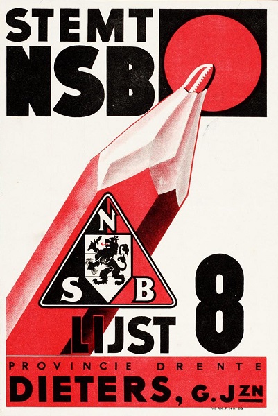Het Drentse NSB-affiche voor de provinciale statenverkiezingen van 1935. Lijsttrekker was de beruchte Dieters, over wie vorig jaar een biografie verscheen door Sienus Nijborg.