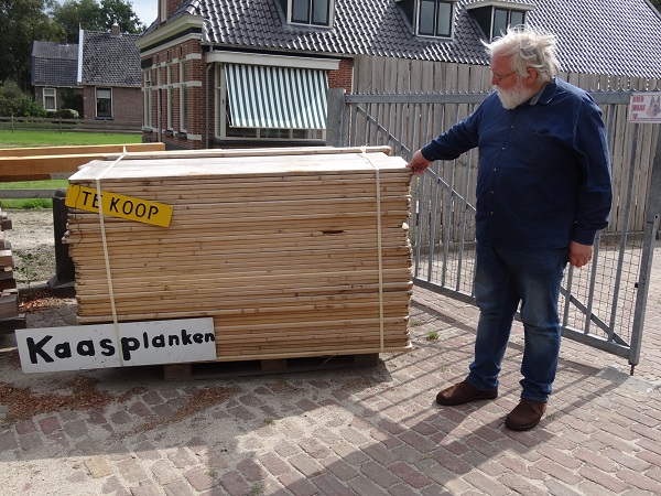 Na de bijeenkomst via Kallenkote naar Wapserveen, waar we uitstapten bij De Olde Fabriek, dat wil zeggen de voormalige zuivelfabriek waarin nu een restaurant met aanschuiftafel zit, al kan je er ook gewoon koffiedrinken of lunchen. Er stond een stapel kaasplanken buiten. Henk zag meteen handel::