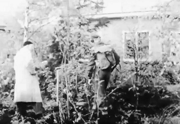 Joël Stoppels ontdekte in een Canadees archief een onbekend filmpje van Canadese militairen die met een metaaldetector aan het zoeken zijn naar een verstopt blik met sieraden. Het filmpje is in Groningen (of in de buurt ervan) gemaakt. Van de omgeving zijn onder meer te zien een huis met een plat, fors overhangend dak, van een type zoals dat in de jaren 20 en begin jaren 30 werd gebouwd. Bij het huis bevindt zich een tuin met vrij recent in rijtjes aangeplante fruitbomen en mogelijk staan er ook bessenstruiken bij de muur van het huis. Het zou dus kunnen gaan om een kwekerij in bijvoorbeeld Eelderwolde, Paterswolde, Eelde, Glimmen, Loppersum of Zandeweer. Is er iemand van de lezers die het huis herkent? Alvast zeer bedankt voor uw reactie!