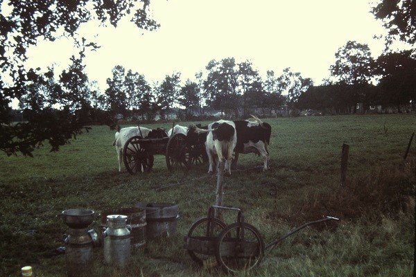 Je had toen nog boertjes met een handvol koeien, die ze met de hand molken. Dat gebeurt hier ook, tegen de avond. De koeien zijn aan het karkas van een ouderwetse boerenwagen gebonden, de boer zit verscholen achter het ensemble zijn werk te doen.