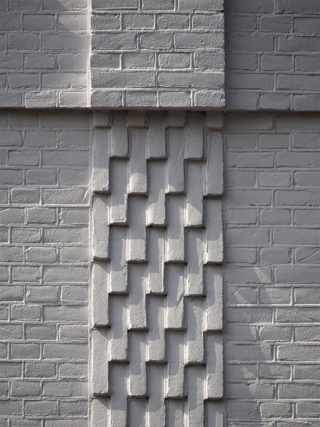 Strijklicht op wit geschilderd siermetselwerk, Zevenhuizen: