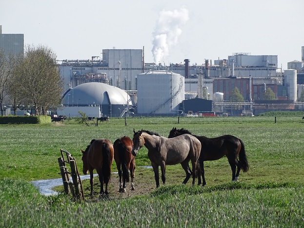 Paarden bij een dam, Leegkerk. Op de achtergrond de suikerfabriek.