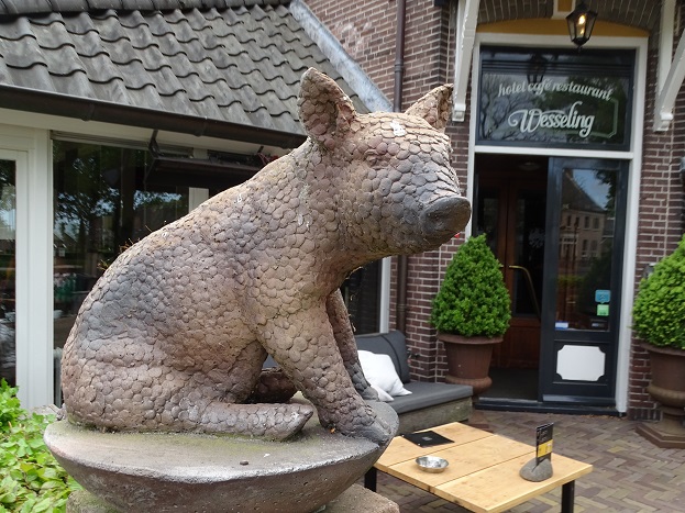 Beeld van varken voor de ingang van Hotel Wesseling: