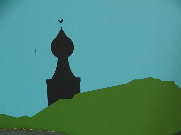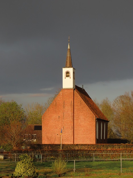 In het volle, lage licht bleek weer eens hoe afzichtelijk lelijk die kale westelijke muur van de Lettelberter kerk is. Terwijl je de iconenschilder die de kerk als atelier huurt, die muur misschien ook zou kunnen laten verfraaien: