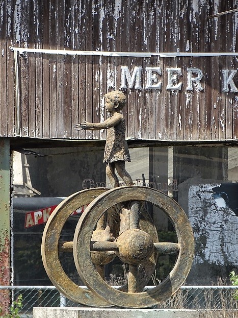 Een van de beelden langs de Hoofdvaart met op de achtergrond een volstrekte en volgens mij bij storm levensgevaarlijke bouwval: