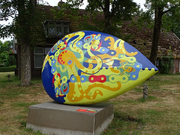 Schoonloo. Monument, begrijp ik, om stil te staan bij de TT. Er staat een geweldig brok kunstenaarsgelul onder, over de motor die hier gesymboliseerd wordt door de octopus, terwijl die motor al bijna een eeuw zorgt voor de aandrijving van een oneindige ketting. Dat klinkt naar een sterfreutel van fossiel-optimisme, maar enfin, het ding op zich vind ik wel mooi (weer eens wat anders dan een dikke zwerfkei):