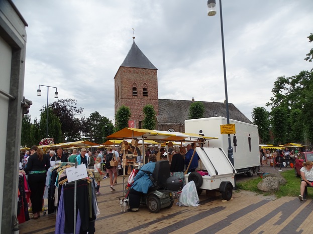 Braderie bij de kerk van Borger. Beeld met die kraampjes zou heel bekoorlijk kunnen zijn, ware het niet dat dikke witte plastic bakken worden toegestaan, die maken dat braderieën in de volgende editie van de bijbel toegevoegd worden als elfde plaag van Egypte. (Niet dat je aan het vrije zicht op de half achter zo’n bak schuilgaande kerk veel wint, want die is van een proto-waterstaatsmodel uit 1826):