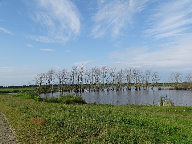 Op meerdere plekken in het Gorecht dode bomen, zoals hier in de buurt van de Blankehoeve bij Noordlaren: