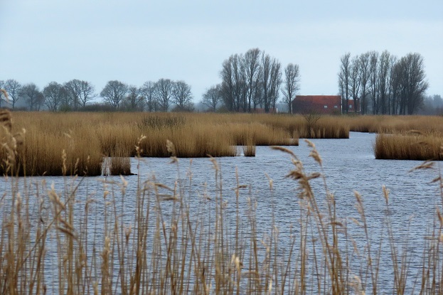 Ouwe dwars geplaatste paardenstal, te zien vanaf een dijkje bij die plas: