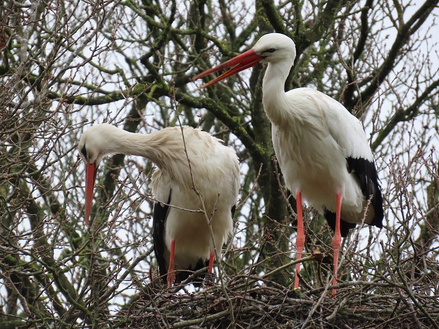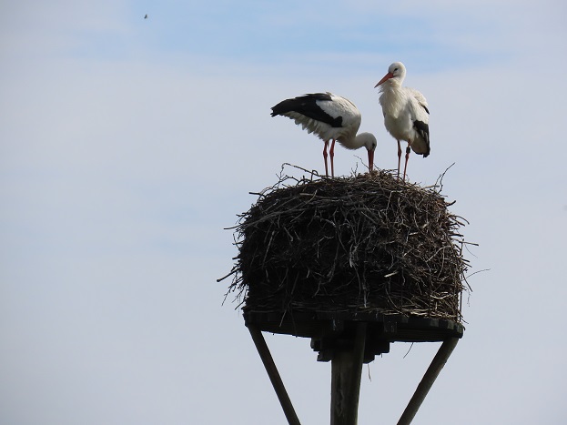Op de Roderwolderweg in Foxwolde hoorde ik geklepper boven me. Dit stel bleek een boom in de berm te hebben uitgezocht voor vestiging van zijn nest. Het is een redelijk drukke weg, ben benieuwd hoe lang ze het daar volhouden: