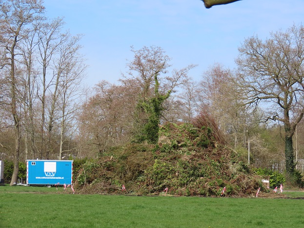 Geplaatst op: 5 april 2023 Hoort bij: Drenthe 1 reactieDe paasbult aan de Boterdijk in Paterswolde waar op Eerste Paasdag de vlam in gaat. Drie van de vijf aanbrengdagen voor snoeiafval en onbewerkt hout zijn al voorbij, maar vrijdag en zaterdag heeft u nog de kans er vanaf te raken tegen betaling van een rijksdaalder per kuub. Zo te zien ligt er nu vooral coniferensnoeisel en rijshout op. De windverwachting voor maandag is zuidoost 2, dus dat wordt in de stadswijken Hoornsemeer en Corpus meegenieten van de smog. Men moet wat over hebben voor andermans traditie. Ik denk trouwens dat die (kurkdroge) eiken aan de andere kant van de Boterdijk ook niet helemaal veilig staan: