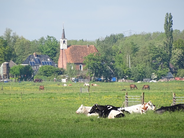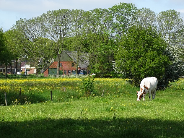 Bij Rome – de koe graast op Drents grondgebied, de huizen op de achtergrond langs de Diepswal van het Leeksterhoofddiep zijn Gronings: