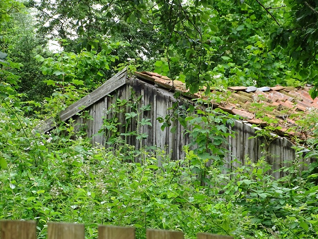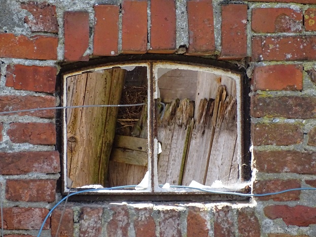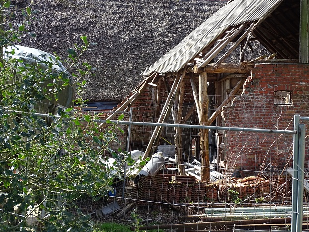 Gezien het asbest dak heeft hij zijn langste tijd gehad – het patchwork van steen, hout en bovenlichten in de zijgevel: