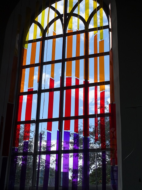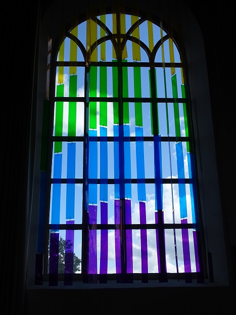 Het is een vrij eenvoudige kerk, die dateert van, even uit mijn hoofd, ca, 1830, maar die stroken gekleurd glas voor de ramen hebben wel wat. Die aan de ene kant: