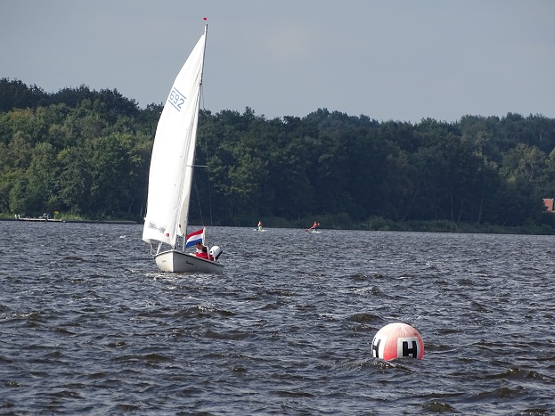 Op het fietspad langs de Meerweg liep een grote groep mensen. Op het meer zelf zag je enkel dit zeilbootje en een paar suppers in de verte:
