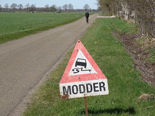 Honderd meter verderop stond er precies zo’n bord aan de andere kant van de weg. Op de weg lag totaal geen modder – blijkbaar had de boer Paasschoonmaak gehouden, maar was hij de borden vergeten: