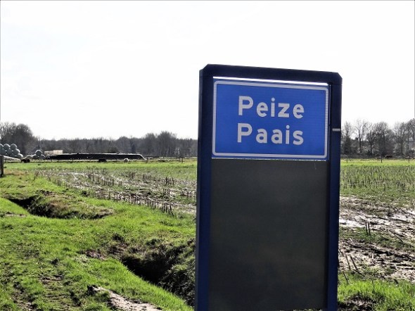 Daar staat sinds medio januari een nieuw plaatsnaambord, dat doet denken aan een Stad-Groninger spreekwoord: “As wiend komt van Paais, is regen an de raais”: