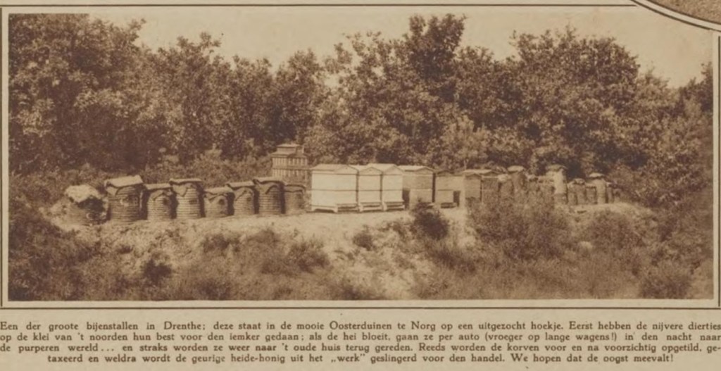 Oosterduinen bij Norg, september 1928. Volgens Het Noorden in Woord en Beeld was dit “een der groote bijenstallen in Drenthe”. Van een stal of overkapping is echter geen sprake, wel van een rij met zo’n 25 korven en kasten, dus volken. Als een noordelijk blad dit al heel wat vond, zegt me dat ook iets over mijn grootvader – die had er als jongeman in de Eerste Wereldoorlog maar liefst 40.