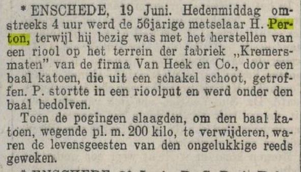 Geplaatst op: 9 december 2021 Hoort bij: Familie 3 reactiesVaak zie je dezelfde berichtjes in allerlei kranten in gelijkluidende bewoordingen terugkomen, maar hoe dichterbij het nieuws, des te uitgebreider het kan zijn. Dat blijkt ook uit het bericht over de tragische dood van H. Perton, die op 20 juni 1913 in de fabriek van Van Heek te Enschede bedolven raakte onder een baal katoen. Terwijl de Amersfoortsche dat ultrakort hield, gaf de Zwolsche Courant die avond wat meer bijzonderheden prijs: