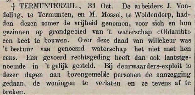 De Jan Vondeling (1833-1921) waarvan hier sprake is, was mijn betovergrootvader. Met een andere arbeider, Meindert Mossel uit Woldendorp, had hij een stuk grond bij het Termunterzijldiep gekraakt om er een woonkeet neer te zetten voor zijn gezin. Blijkbaar was het niet gelukt om gewoon een woning te huren. Het waterschapsbestuur liet deze “daad van willekeur” niet over zijn kant gaan en sprak hem voor de rechter aan. Die bonjourde de familie van het waterschapsperceel af.
