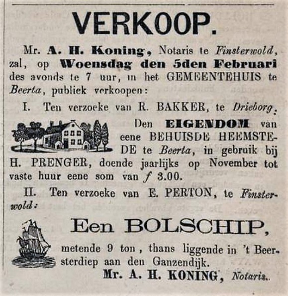 Natuurlijk heb ik meteen gezocht op mijn familienaam,. Het allereerste zoekresultaat bleek een advertentie uit eind januari 1873 voor een veiling in hotel Het Gemeentehuis te Beerta, waar onder andere het bolschip (of de praam) van mijn betovergrootvader Elzo Perton onder de hamer kwam.