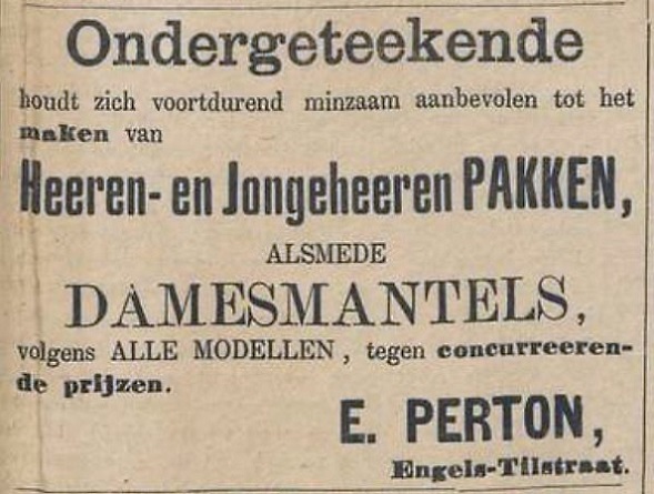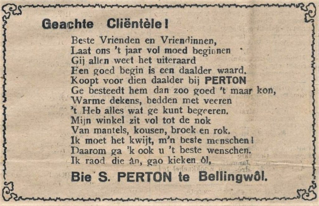De Bellingwolder tak die zich rond 1820 van de Oldamtster familie Perton afsplitste, was niet alleen wat commerciëler, maar ook wat cultureler, zo blijkt uit de Winschoter Courant. Exponent was Sieno Perton, die er net niet in slaagde om in drie eeuwen te hebben geleefd. Hij had een manufacturenzaak in de buurtschap van de Rhederbrug, waar hij voor de oorlog een grote rol in het lokale verenigingsleven speelde. Na de oorlog is hij nog jarenlang PvdA-wethouder van Bellingwolde geweest. Deze advertentie van hem stond in de Winschoter Courant van 31 december 1932.