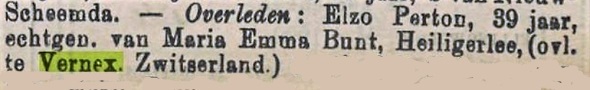 Volgens de corresponderende overlijdensakte van de gemeente Scheemda was deze Elzo Perton gestorven in het ziekenhuis te Vernex, een dorpje vlakbij Montreux in Franstalig Zwitserland. Vooordien oefende hij het beroep van kleermaker uit. Hij was begin 1861 geboren, dus nog geen 40 jaar oud, en het stuk noemt als zijn ouders ene Gehrad Perton en diens vrouw Maguerite. Met zijn vrouw Marie Emma Bunt woonde Elzo in Heiligerlee, maar hij zou wel gedomicilieerd zijn geweest in Vernex.