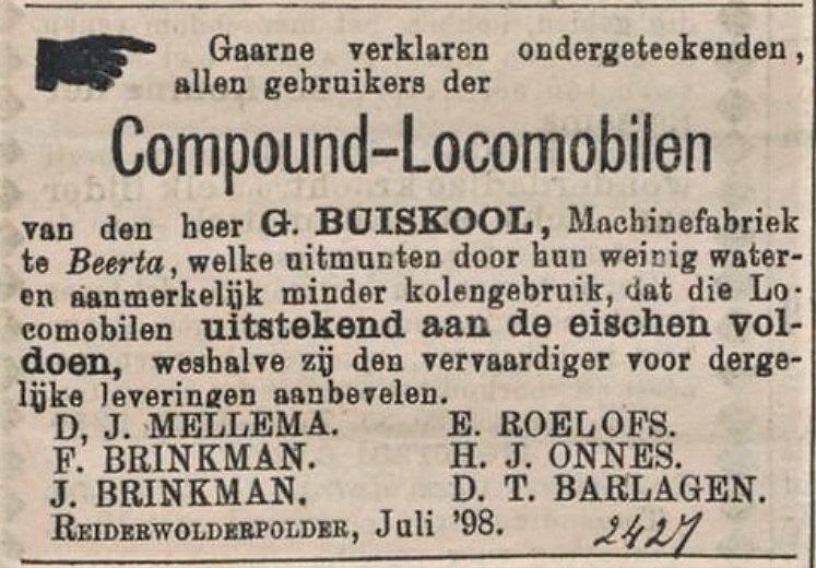 Advertentie uit de Winschoter Courant van 8 augustus 1898, waarin zes boeren uit de Reiderwolderpolder een goed woordje doen voor de zuinige locomobielen van machinefabriek G. Buiskool te Beerta. Gezien de advertentie erboven maakte dit in elk geval sinds 1893 bestaande bedrijf naast locomobielen ook stoomketels, dorsmachines en zaagmachines. Bovendien is er vlak na de vestiging sprake van korenpletters, bonenbrekers en sproeimachines. Vanaf 1898 deed Geert Buiskool echter tevens in fietsen van de Duitse merken Hercules en Albatros.