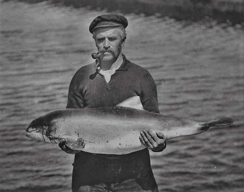 Coverfoto van Het Noorden in Woord en Beeld de dato 7 juni 1929, waarop de garnalenvisser Jurjen Bakker uit de Reiderwolderpolder (gemeente Finsterwolde) poseert met een bruinvis die hij een week eerder aantrof in een van zijn garnalenkuilen. Volgens het bijschrift zou het beest niet lang meer “speulen as ’n broenvisch”. De visserman droeg het dan wel op handen, maar had het getuige de bloedsporen bij de snuit een beste klap verkocht.