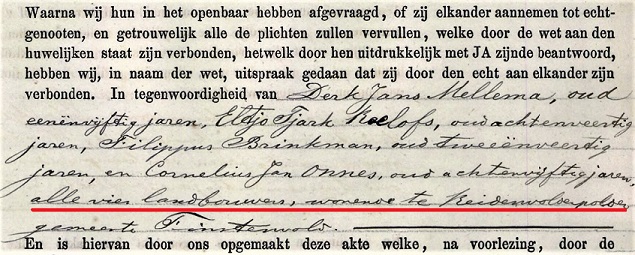 Misschien kwam het een enkele keer wel eens voor dat een boer als getuige optrad bij een huwelijk van arbeiderskinderen, maar hier ging het om vier stuks, en dat terwijl in het Oldambt de sociale afstand tussen boeren en arbeiders vrij groot was en steeds groter werd. In de flankerende akten komen de vier ook niet voor – het was dus niet zo dat het boerenkwartet toevallig in het gemeentehuis aanwezig was, ze waren hier speciaal voor dit huwelijk.