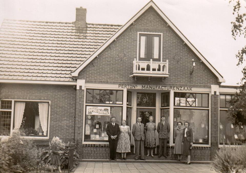 Van mijn achter-achter-achter-achterneef René kreeg ik nog deze foto toegestuurd van Sieno Pertons manufacturenzaak bij de Rhederbrug in Bellingwolde, ergens in de jaren dertig: