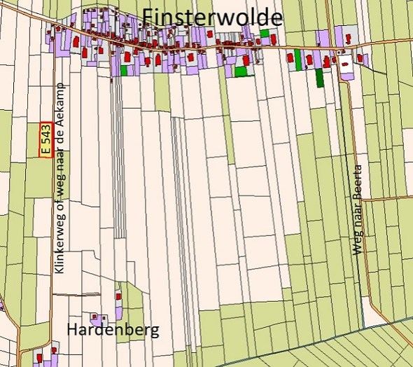 Het anno 1880 in bouwpercelen verdeelde stuk weiland (E 543) van boer Wester, links bij de Klinkerweg, en zijn ligging ten opzichte van Finsterwolde. Bron: HisGis.