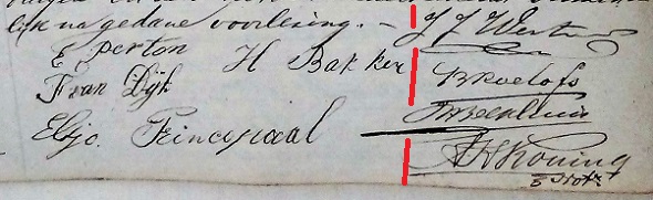 De handtekeningen onder de koopakte van 1880. Links van de rode streep de onbeholpen pootjes van de kopers, allen arbeiders; rechts van de rode streep de veel geroutineerdere signaturen van de verkoper, diens getuige, een notarisklerk en de notaris zelf.