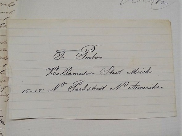 Het is het adres van zijn zoon Freerk Perton, een kleermaker die in 1893 met zijn gezin naar Amerika emigreerde. Freerk woonde daar als Frederick Perton in Kalamazoo Michigan, en wel op het adres 15-15 North Park Street.