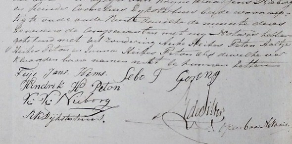 Bij de ondertekening van de akte verklaarden Aeike, Aaltje en Janna Heikes Peton, dus de drie oudste kinderen van hun vader, “haare namen niet te kunnen zetten”. Alleen Hindrik Heikes Peton was daartoe bij machte, net als zijn beide aanwezige zwagers. Alle drie zetten ze een beetje houterige handtekening.