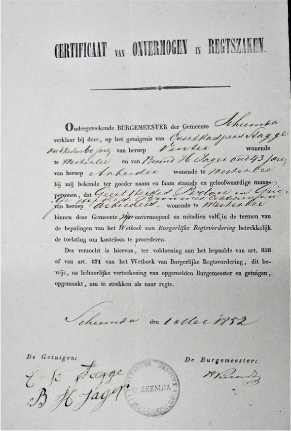 Verklaring van onvermogen, op 1 mei 1852 afgegeven door de burgemeester van Scheemda aan Geert Heikes Perton (ook wel eens Peton genoemd) en diens vrouw Grietje Brouwer, arbeiders wonend te Westerlee.