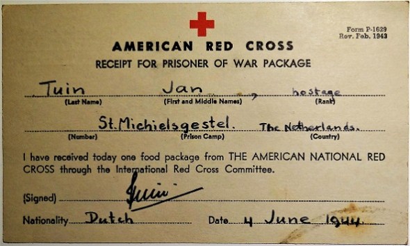 Geplaatst op: 21 maart 2017 Hoort bij: Familie, Geschiedenis 2 reactiesTwee dagen voor D-Day kreeg Jan Tuin, gijzelaar van de Duitsers te Sint Michielsgestel, een voedselpakket van het Amerikaanse Rode Kruis. Dit kaartje diende als ontvangstbewijs. Het is getekend –