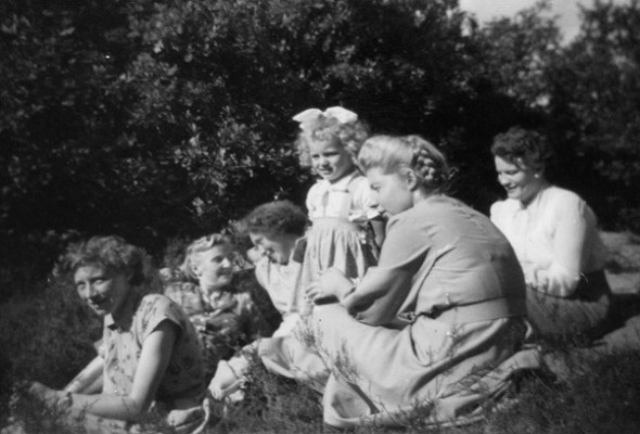 Fennie midden tussen haar moeder (uiterst rechts) en tantes. Mijn moeder tweede van links. Circa 1952.