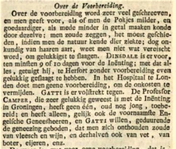Geplaatst op: 14 maart 2021 Hoort bij: Geschiedenis 1 reactieHet encyclopedische woordenboek van Chomel uit 1778 bevat een lang artikel over “inenting der kinderpokjes”, dat Groningen en Petrus Camper nogal eens noemt. Mijn oog bleef haken bij een passage over de voorbereiding tot de handeling – de heren onderzoekers dachten destijds heel verschillend over nut en noodzaak daarvan: